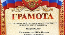 Предподаватель Новолакской школы искусств Алиева Гулжахан Бустаминовна награждена почетной грамотой за профессиональную подготовку учащихся на Республиканский конкурс – выставку изобразительного искусства «Гамзатовские странички» и вклад в развитие детского художественного творчества.