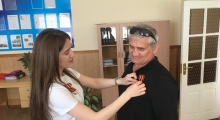 В школах, учреждениях и организациях, на площадях, автобусных остановках волонтеры раздают символ победы и памяти – Георгиевскую ленточку.