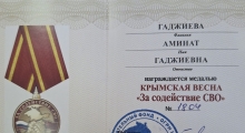 Аминат Гаджиева из Новолакского района награждена медалью Крымская весна «За содействие СВО»