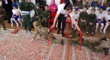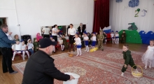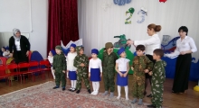 В оформленный шарами и праздничными плакатами актовый зал, с флагами России и Дагестана, и камуфлированной одежде, армейским строем зашли воспитанники двух старших групп, напевая песню о защитниках Отечества.